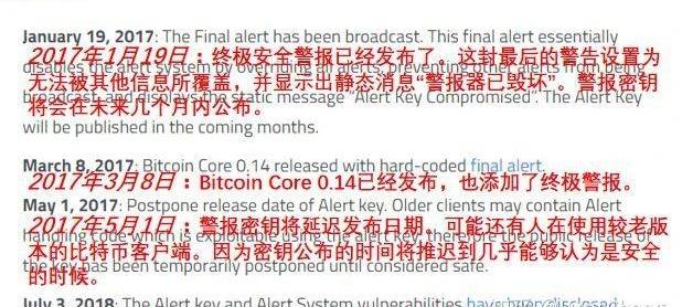 截圖源自:bitcon.org到了2018年7月,隨著較老版本客戶端使用者占比降低至3%以下,隨著絕大部分比特幣山寨幣將警報系統刪除,歷時八年的安全隱患終于在BitcoinCore開發者BryanBishop公開警報私鑰后“完全解除”。