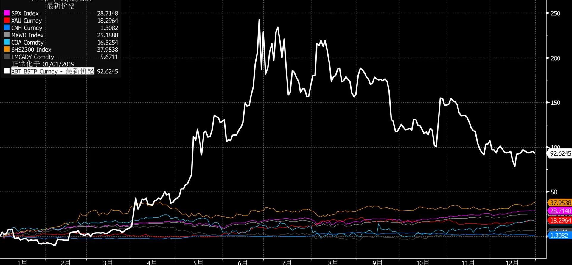 2019年,隨著貨幣發行繼續擴張,可以看到,這條紅色線代表的標普500的全年增長是百分之二十多,中國的股市滬深300增長了37%,還可以看到黃金也在漲,所以大類資產都在漲,甚至人民幣也漲了。再看加密貨幣業最具代表的比特幣,它的變化是什么樣的?如果單看比特幣的話,會覺得今年挺波瀾壯闊,暴漲了一波后又暴跌,其實相較于其他大類資產來說,比特幣的全年漲幅是特別優秀的,全年增長差不多接近100%。所以結論是,在去年所有大類資產里邊,比特幣是增長率最好的資產。最近經常有人說比特幣市場面臨寒冬,但是,其實比特幣在去年一整年的表現非常優秀。我們應該忽略掉市場里面的波動,去看它整體的表現。為什么去年比特幣會暴漲暴跌?因為去年是事件驅動的一年。2019年5月8號,中美貿易戰沖突升級,開始加關稅,比特幣暴漲了30%;6月,Libra白皮書發布,又暴漲了一波;10月底,中央局集體學習區塊鏈,比特幣還是暴漲了一波。但是,增長過程中非常曲折,在多個事件驅動下比特幣也有下跌出現。9月22號,Bakkt上線。Bakkt是歐美金融機構合規買入比特幣或者合規交易比特幣的渠道。當時開出的第一天,交易量只有8個,這和大家的預期差異非常非常大,市場覺得沒有達到預期,因此9月22號又暴跌了一波。