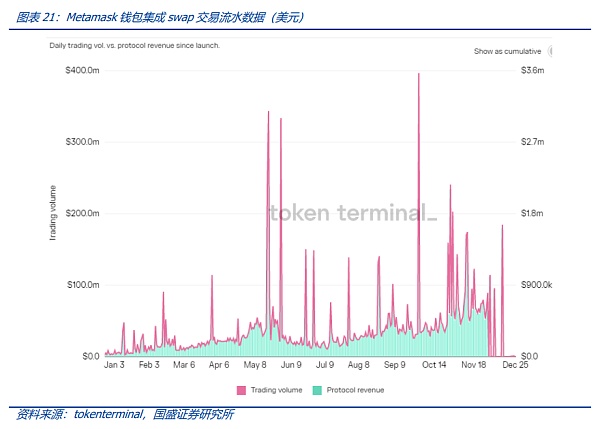 2021年下半年隨著NFT交易市場的火爆,Opensea進入交易額和交易量激增時期,8月單月交易額超過34億美元。作為應用最為廣泛的瀏覽器錢包插件,Metamask的流量入口價值得以體現,用戶基于其使用swap交易額和平臺手續費亦有較大增長。2021年9月30日交易額近4億美元,平臺手續費收入350萬美元。