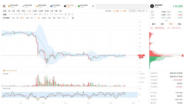 EOS并未站穩2美元籌碼集中區域,走勢和ETH類似,短時變盤向下的可能性較大,但還得看BTC的走法。