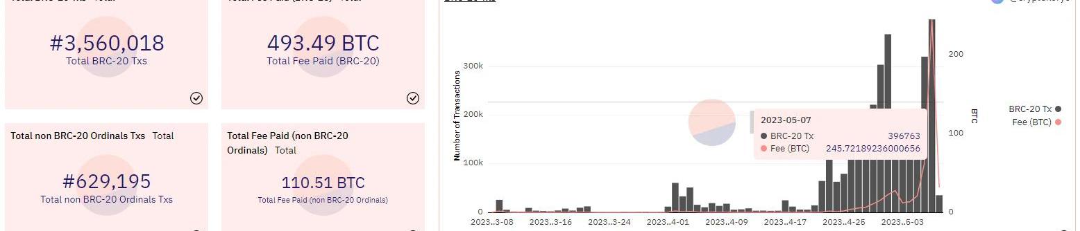 比特幣平均交易費用趨勢圖礦工收益的構成——目前,礦工的收益構成分別為兩大塊:●區塊獎勵:6.25$BTC/區塊●交易費用:也就是打包交易的手續費。交易費用的多少依據網絡情況以及用戶的設定而不同,以每個字byte來衡量,目前比特幣memepool池中的低優先級平均費用大約為300sats/byte,也就是大約11u/字節。比特幣礦工的單個區塊交易費用收入也從5月1號開始超過1$BTC,并一路高歌猛進,在8號上午過去的幾個小時里,礦工單區塊的交易費收入更是一度達到了驚人的6$BTC,有的區塊的交易費用甚至超過了本身的區塊獎勵。目前,BRC-20總計支出的交易費用大約493枚比特幣,其中245枚都是在最近24個小時內花費的,占到了BRC-20誕生以來的支出費用的49.6%