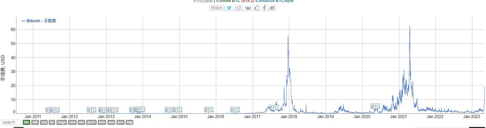 此輪比特幣網絡交易費用的上漲主要來源于ordinalsNFT以及BRC-20的炒作熱潮。