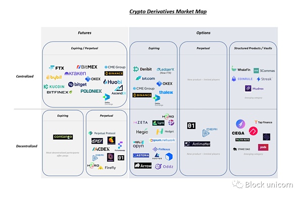 此外,與中心化交易對手相比,期貨和期權的去中心化衍生品市場明顯欠發達。下圖展示了這種相對的市場集中度。