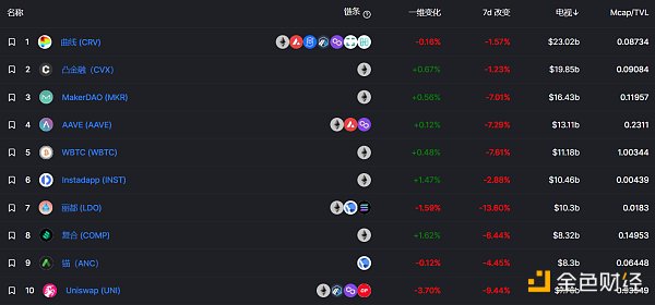 DeFi項目鎖定資產前十排名及鎖倉量 數據來源:defillama