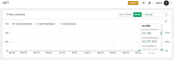 在過去的幾個月里,NFT也成為了Twitter、Instagram和Facebook在內的幾乎所有主要社交網站的搜索詞。每月社交媒體的累計訪問量從去年12月的260萬增加到目前的3500萬。這是根據Brand24社交媒體分析工具生成的數據得出的。自去年12月以來實現了最大的搜索量。