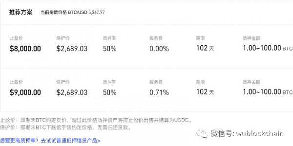 4.再說期限:在這102天以內,如果比特幣跌到1萬,不會平倉,也不用補保證金;如果漲到10萬,也不能提前還款。
