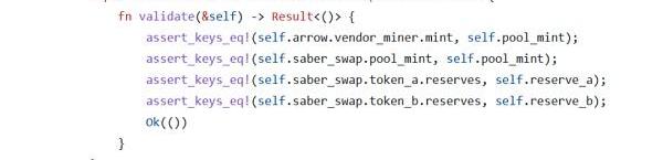 為了鑄造新的CASH,用戶需要存入抵押品。鑄幣過程的正確性在用戶將“抵押品”轉移到項目中進行驗證。在crate_collateral_tokens的驗證過程中,合約檢查token類型是否與saber_swap.arrow賬戶的類型相匹配。
