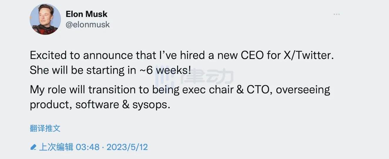 XRP/HKD-5.44%今日,馬斯克在社交媒體宣布即將為twitter聘請一位新任CEO,而自己將成為執行主席兼CTO,負責監督產品、軟件和系統等,字里行間不難看出twitter新任CEO是一位女性,即將在6周后正式成為twitter新任CEO。