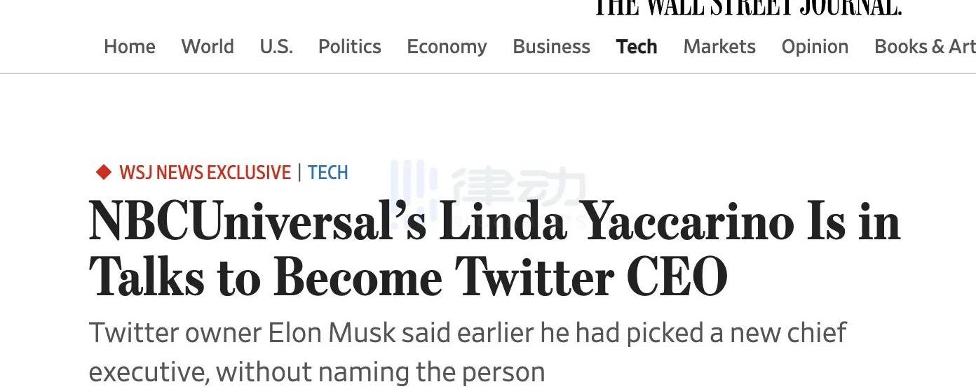 有意思的是,馬斯克并未透露過多關于這位新CEO的信息,但隨后《華爾街日報》刊文表示:知情人士透露,NBC環球公司廣告主管LindaYaccarino正商討成為Twitter新任CEO的相關事宜。