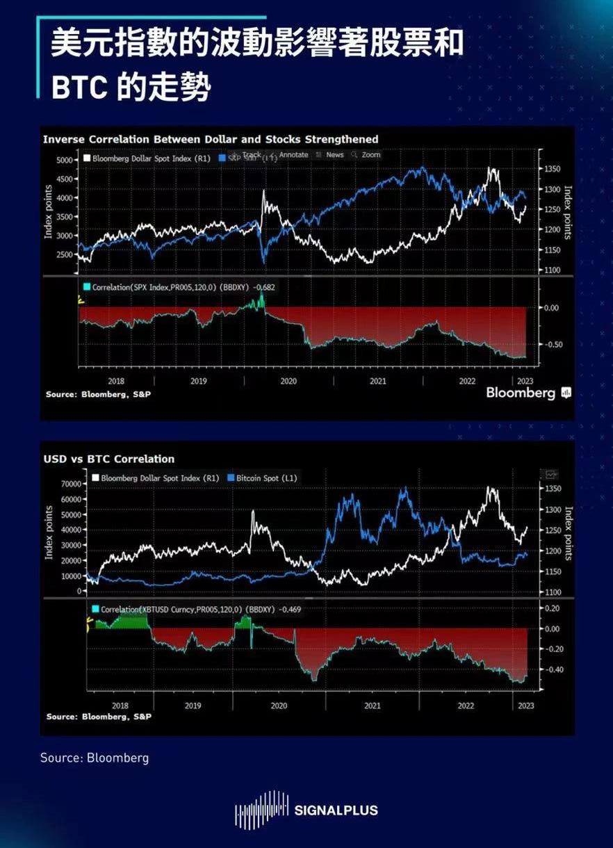 就推動市場的因素而言,考慮到終端利率最近已經重新定價走高,美元現在成為了最主要的風險晴雨表,它與其他資產類別的負相關性已升至過去5年來的最高水平。BTC和美元之間也有類似的關系,但程度較輕,目前幾乎所有交易都是以美元為基礎。