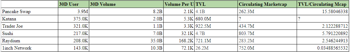在上文,我已經提示過 Ronin 的價值在于作為基礎設施層捕獲價值。一種估值的方式是衡量其上的應用層,并且根據他們的表現進行估值。請記住──我并沒有計算 Axie Infinity 的收入而僅僅關注了 Katana DEX。首先,我從 DappRadar 收集了過去 30 天的 DEX 交易數據。Katana 以大約 37.5 萬的用戶排名第二,這些數據并不會讓我們給一個估值的結論,而是給出一個 Katana 大致的排名。你同樣可以發現的是,Katana 相比 Sushi 或者 1inch 交易量低的多,部分原因是其他的交易所更多的服務的是 DeFi 的原生客戶,通常他們每筆的交易額更大。
