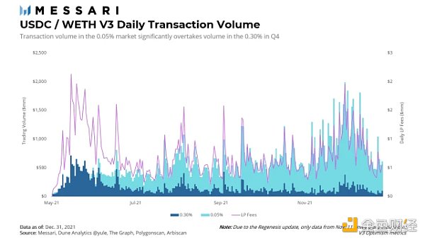 2021 年 5 月 24 日,V3 市場的 LP 賺取的每日費用超過了 V2 市場——盡管在今年剩余的幾天里,V2 市場的單日費用確實高于 V3 市場,但總體發展趨勢是后者。事實上,第四季度流動性提供者從 V3 產生的累積收入比 V2 多 183%,這歸因于較高的交易量抵消了較低費用等級帶來的較低每筆交易費用的結果。
