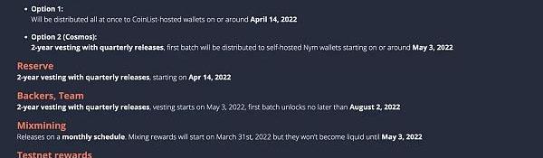 NYM代幣的分配以及發布過程如下圖所示。2022年4月14日開始發放,24個月內既釋放完除挖礦獎勵外所有代幣分配,剩余挖礦獎勵100個月完全發放完畢。