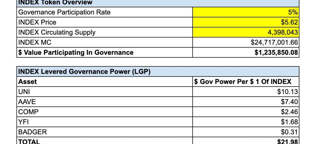 如上圖表格所示,隨著參與到投票的流通代幣數量增加,每1美元的INDEX所擁有的最大治理能力會減少。