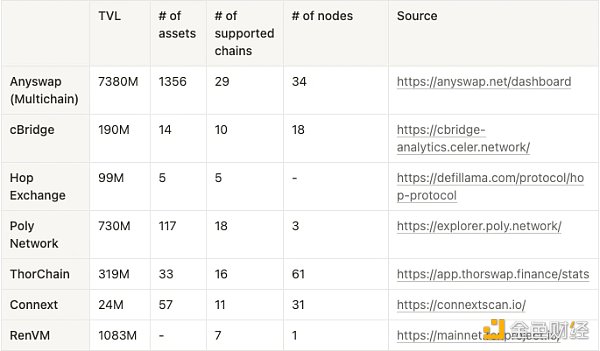 通過上述表格可以看出,目前擁有節點數最多的是ThorChain, 其次是Anyswap和Connext. 然而,ThorChain并未披露其節點運行者的具體信息,匿名運行者的可靠性存疑,縱使擁有按節點數量評估下最高的去中心化程度,依舊要為其安全性畫上一個問號。