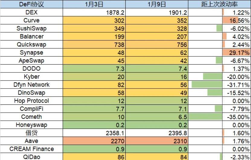 Solana鏈繼續呈現下降趨勢,連續下降幅度較大;本周跨鏈協議SynapseProtocol依舊保持了較高的TVL增長,上周上線了基于NEAR開發的EVM協議Aurora,可通過nUSD池從任何EVM鏈橋接USDC和USDT,帶來的增長明顯,但其代幣SYN本周伴隨著行情端的下跌出現了大幅度下降;另外值得關注的協議有QiDao,其TVL已經保持長期穩定的增量,協議內容是Polygon上的穩定幣借貸協議,用戶可通過質押token資產獲得MAI穩定幣,且無需支付利息。