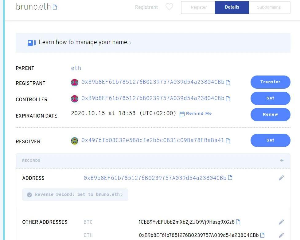 ENS應用程序允許ENS域的所有者檢查所有與該域綁定的記錄,并添加新的記錄。