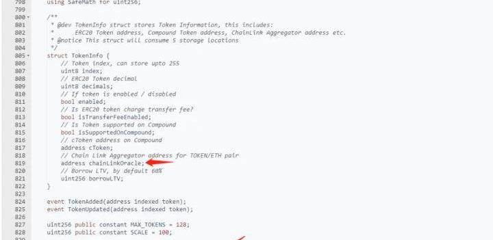 在該函數中使用AggregatorInterface(tokenInfo.chainLinkOracle)的預言機來詢價