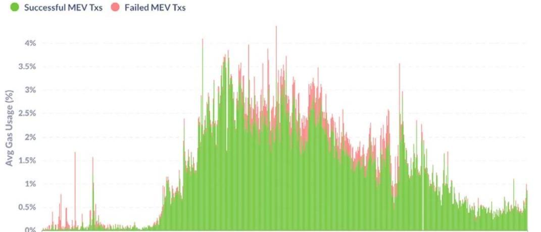 在倫敦硬分叉到大規模的DEX交易量遷移至L2這段時期,MEV在網絡使用中的百分比相比年初下降了80%以上。