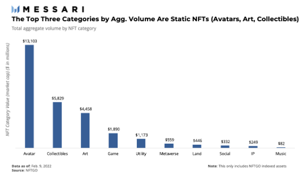 目前,NFT 行業的交易額累計已超過 280 億美元。隨著新人源源不斷地涌入,越來越多的公司利用現有 IP 或推出新 IP 發行非同質化 Token,這一行業仍將持續繁榮。與上圖相似,頭像、藝術和收藏品類 NFT 占據交易量大頭。但更重要的是,從根本上看,這些 NFT 都是靜態 NFT,這意味著它們除了代表相應資產的所有權和 Discord 訪問權外,絕大多數都無法提供額外的實用價值。盡管靜態 NFT 十分珍貴,但是隨著投資者逐漸傾向于追求通過所持資產獲得更優質的體驗,人們對非靜態 NFT 的需求將不斷攀升,主要包括游戲資產、實用資產和音樂類 NFT 等。