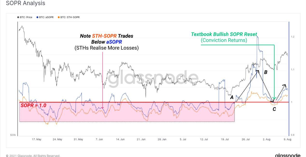 ASOL指標可以反映每筆交易花費輸出的平均幣齡(不受花費代幣數量的影響)。隨著ASOL指標在2021年Q1和Q2的持續走高(紅色箭頭),大量持有時間較長的籌碼在鏈上支出,BTC也觸碰了階段頂部。5月份的價格暴跌導致該指標大幅走低(藍色箭頭),表明長期持有者不愿意以暴跌后的價格出售。