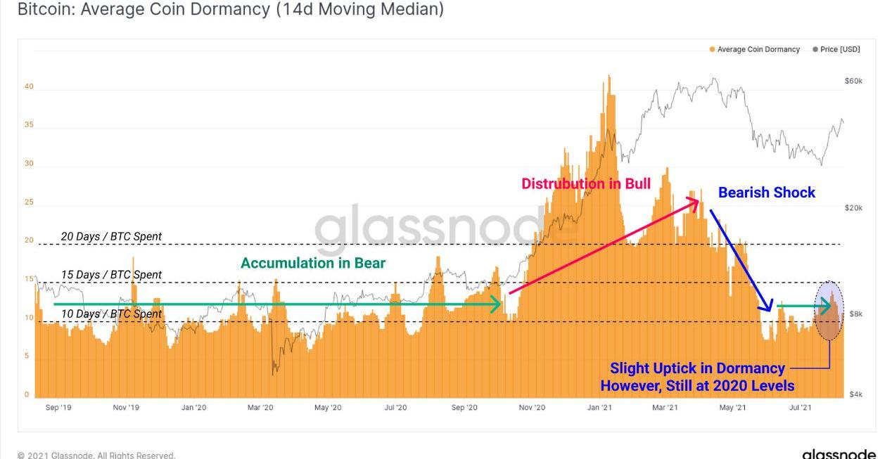 基于14天中位數的平均休眠時間已下降到10天左右,這與整個2019年和2020年的積累期相同,表明長期持有者并未在現階段賣出手中的籌碼。