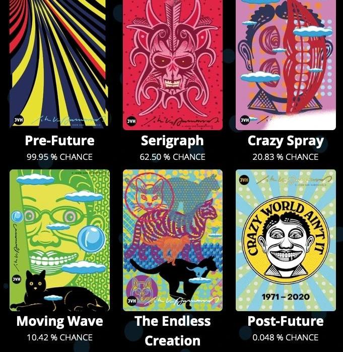 相比單一的數字版NFT發行,這次JohnVanHamersveld發行的NFT采用了WAX區塊鏈的vIRL技術,即與實物商品綁定在一起,持有者可兌換相對應的JVHvIRL實物收藏品,其中包括吉他撥片和經典圖案的琺瑯徽章等。JohnVanHamersveld本人認為這是藝術圈里的新領域,“收藏家能與我最喜歡的藝術媒介進行交互。每個NFT都充分展現了我多層次的獨特創作風格,包括形狀、色彩、陰影、概念。”