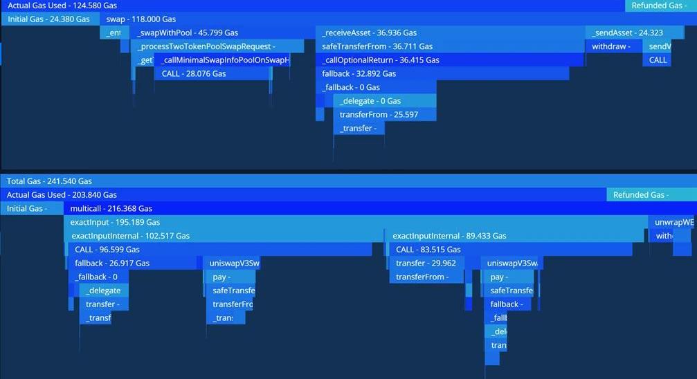 一筆交易可以調用任意數量的函數并與許多不同的智能合約進行交互。下面,我們可以看到使用Tenderly提供的工具進行的兩個不同交易的gas消耗明細。如您所見,第二筆交易最終比第一筆交易多花費了70%的gas。