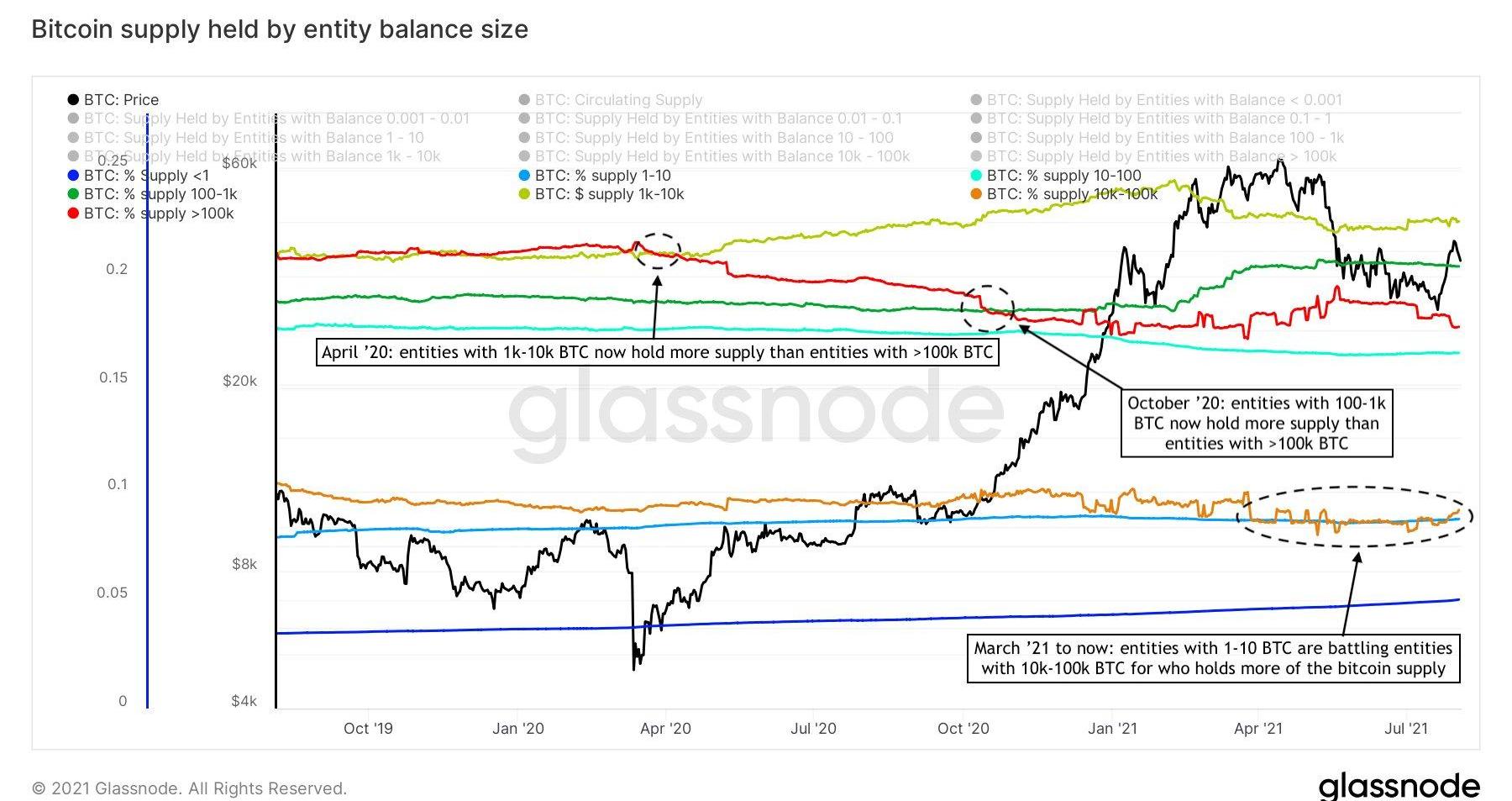 上圖展示的是鏈上實體(相同所有者的地址集合)的持有量分布圖。自5月以來,囤幣行為最激進的是持有<10BTC的實體。這些小型持有者現在擁有比特幣流通供應量的13.8%,創歷史新高,并且從5月開始積累趨勢明顯加速。持有1-10BTC的實體(淺綠色區域)也逆轉了1月以來的下降趨勢,并恢復了積累行為。