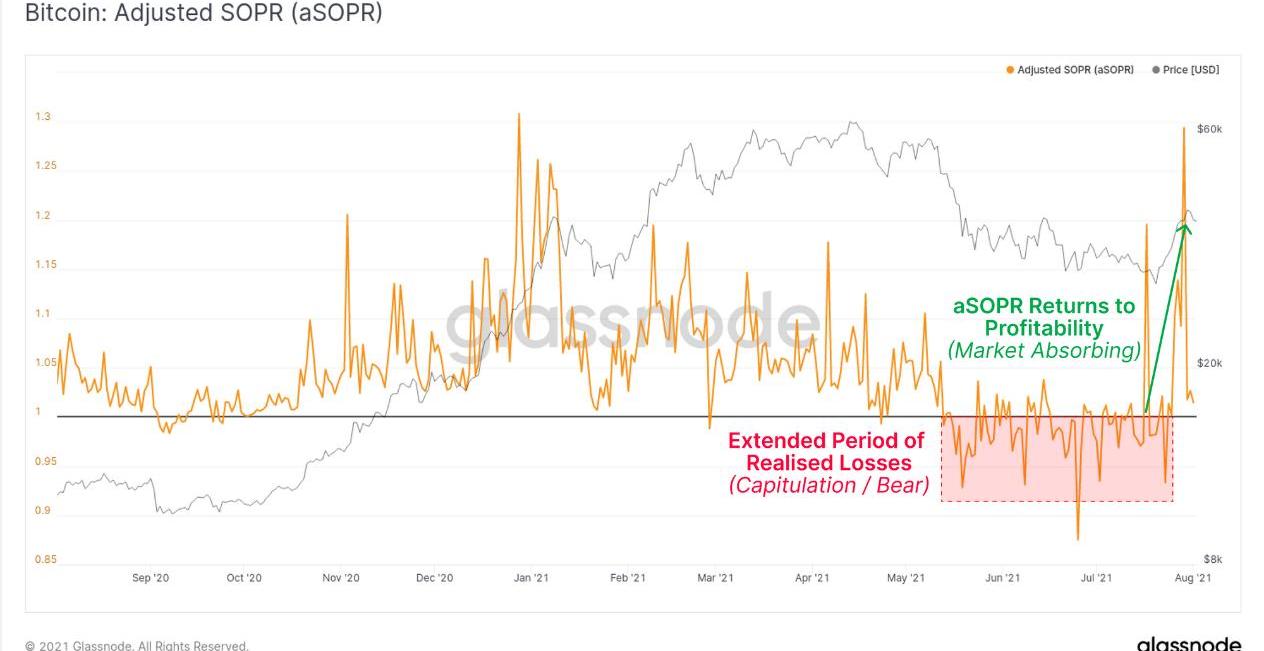 aSOPR(調整后的SOPR指標)可以反映總體市場已實現盈虧的情況。如上圖所示,自5月份的拋售以來,大部分鏈上籌碼進行了止損。每次價格反彈時,交易者都會賣出籌碼(aSOPR指標的1.0位置成為明顯的阻力位)。