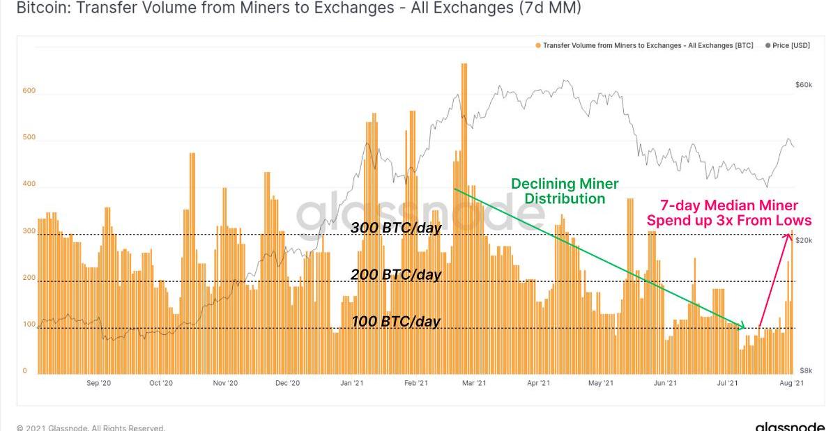 礦工每天轉到交易所的比特幣數量在7月中下旬觸底(低于100BTC/天)。但是,該數據本周已經增加到300BTC/天,比7月的低點增加了3倍。這一現象表明,有相當一部分礦工正在趁著反彈套現。