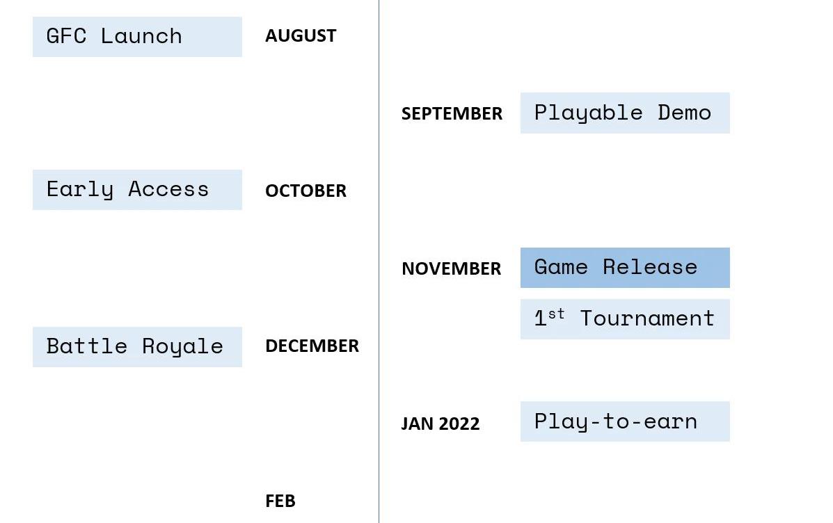 目前游戲處在開發的最后階段,預計將在今年11月份推出。游戲推出后,錦標賽和1v1玩家對決將正式開始。GFC將于11月舉辦首次官方錦標賽,設置的最高獎金為100ETH,勝者可以獲得全部的100ETH。