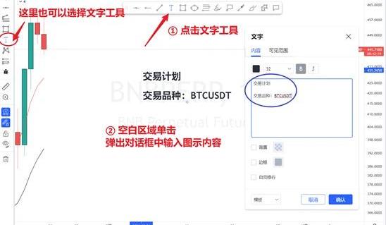 第五步確定入場方式常見的入場方式有3種,分別是掛單入場、突破入場、確認入場,下面簡單介紹l掛單入場:當價格第一次來到該價格時,訂單立刻成交l突破入場:做多舉例,當價格自下往上運行至改價格,訂單立馬市價成交l確認入場:當價格來到該價位時,等待交易信號我們以掛單入場來舉例說明,RT,我在BTC掛了46000買入做多的交易單,入場方式為掛單入場,當價格由48000下跌到46000時,我的訂單就成交了,確定好入場方式,這一步就完成了1、打開記事本或者隨便能記錄文字的軟件,以TradingView空白區域舉例輸入格式:“入場方式:掛單入場”