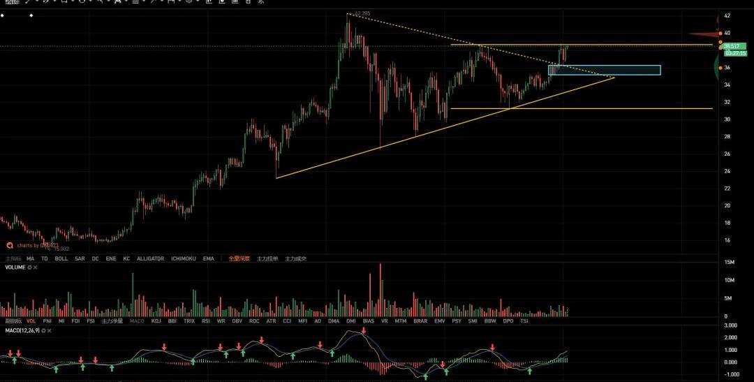 如圖所示,波卡雖成功向上突破三角收斂,但回踩幅度之大令當時身在局中之人難免懷疑是假突破,剛好回踩至突破結構后形成的短期需求區35.2-36.4,上方已經觸發周線級別孕線結構上軌,周內可重點尋找做多機會。