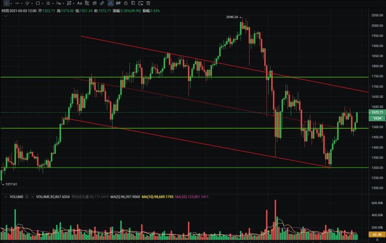 ETH:昨晚雖然快速下探了一波,好在最終守住了1500美金的關鍵支撐。繼續持倉等待,注意上方1750美金壓力位。合約方面,穩健者等待支撐位附近介入多單,激進者1535美金附近介入多單。