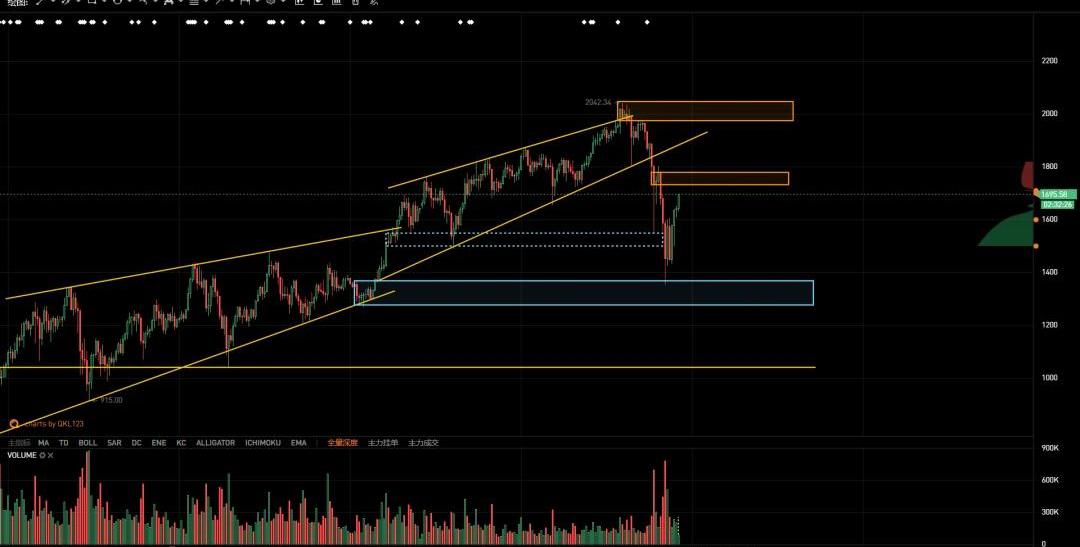 以太坊與比特幣形態結構類似,均出現“V轉”形態。前日初次下殺于上期報告中所畫藍色矩形位置1550有效止跌,昨日二次下殺打出短期低點1355,并于此位置止跌,該位置附近可視為短期支撐,即圖中藍色實線矩形區間1300-1370;上方短期壓力關注供應柱上緣附近1730-1770。