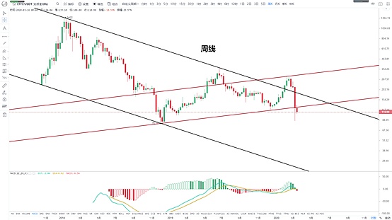 周線上,可以發現經過前期不斷下殺,價格目前已接近長期上升通道下沿支撐線附近,此處存在一定的多頭支撐,技術上只要不跌破,都不能判定長期上升趨勢的逆轉。
