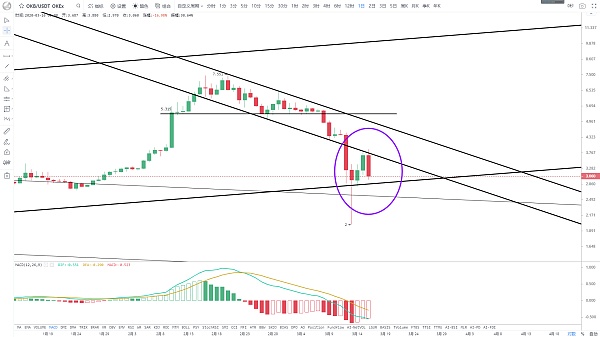 如今,BTC周線同樣跌破一直依托上行的關鍵趨勢線支撐,價格從跌破點7800美元大幅下殺至3800美元低點再回升,區間最大跌幅高達52%,調整幅度也比較強,周線收出天量下影線,市場抄底資金涌入,個人認為,第三次的不破不立大概率將重現。不過,從近幾天的反彈來看,成交量明顯縮量,反彈力度并不強,大部分主流幣也沒有創出反彈的新高,目前整體仍處于大跌后的震蕩盤整走勢中,短期空頭依舊占據優勢,后面有可能形成二次探底背離形態,類似于前兩次的破位走勢,以時間換空間等待新一輪牛市的到來,經過充分調整的BTC,中長線已經具備了較好的關注價值,耐心尋找布局時機,等待底部結構的形成,讓市場恐慌成為買入的又一次良機。