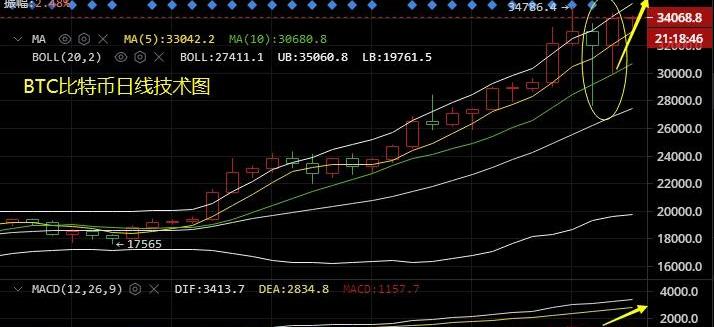 綜上所述:高位牛市之中,大餅兩度下破30000美元關口,但多頭依然強勢收復跌勢并持穩向上,目前處在歷史高點附近,行情有望繼續上破,若是刷新高,我們可以順勢追多,倘若出現回調的話,那么我們可選擇低位做多,今日我們可重點關注短中線目標35000美元關口。對于現.貨的話,短線的趨勢可跟隨合約,大趨勢繼續看漲,而每一次的回落都是你分批囤幣的時刻,不管你是現貨還是合約做中長線的話,心態一定要放端正,千萬不要受行情左右,堅持下去,市場會給你最滿意的答案。若對技術行情以及消息面解讀把握不定或者持有套單的朋友皆可與談老師進行探討。