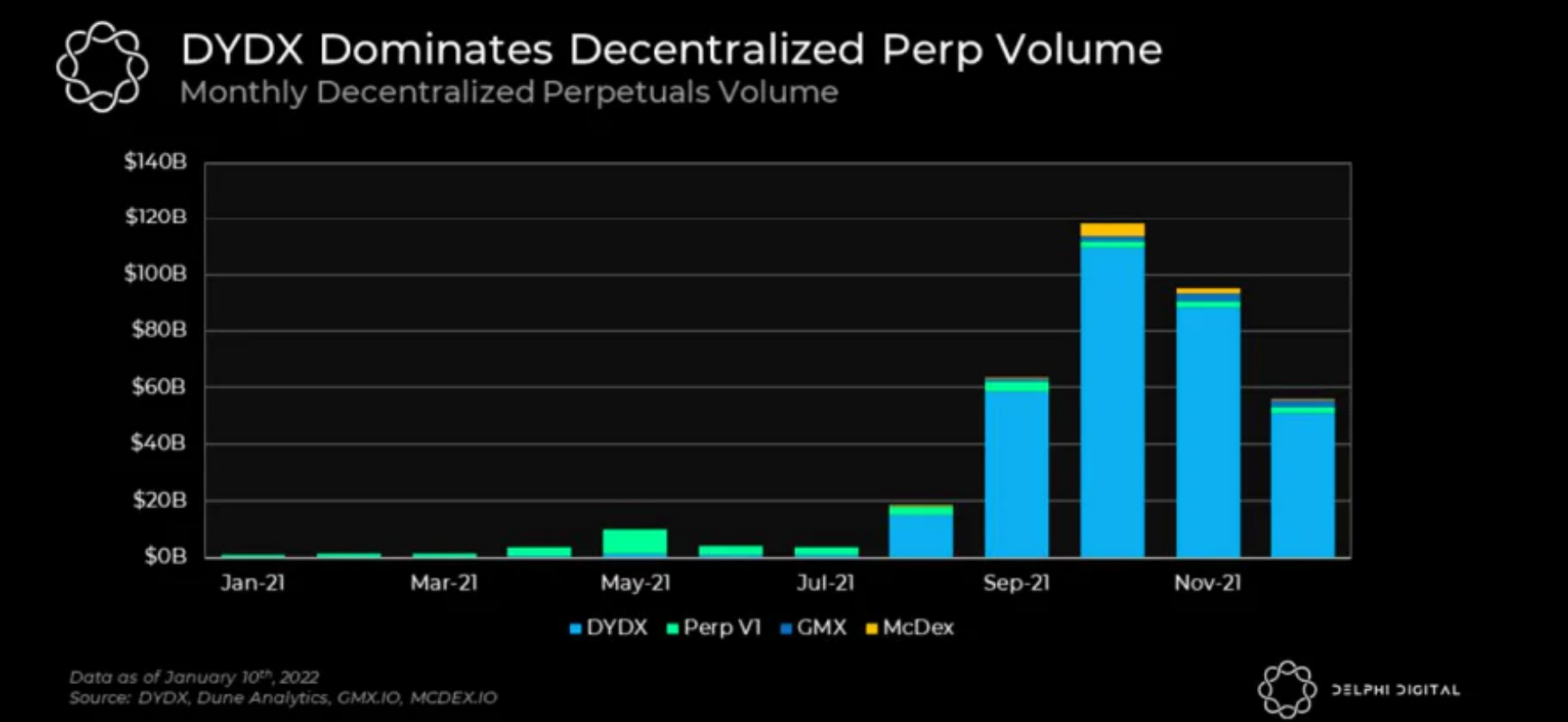 去中心化衍生品在 2021 年迅速升溫,在其超越其中心化同行前仍有巨大的增長空間。dYdX 在 DeFi 衍生品領域處于主導地位,Delphi Digital 預計它仍將成為一個重要的參與者,但 2022 年去中心化衍生品的競爭可能會隨著更多永續合約交易平臺在各種擴容解決方案中推出而升溫。