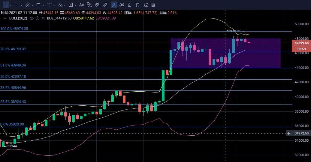 BTC:從4小時圖看,目前大餅的行情可能會保持一個高位震蕩的趨勢,50000美金大關在即,拋貨的量自然也不少,壓力自然也就大。但現貨的朋友可繼續持有,給它一個短時間修復,修復時間越長,那突破50000美金以后繼續拉升的機會就越大!合約方面,還是圍繞前幾次的進場點位,44800到44000美金區間分批介入多單。