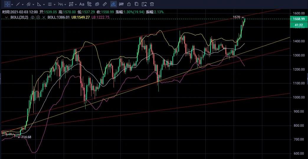 ETH現貨:我們可以看的出來,以太的強勢引領主流走勢拉升。沒上車的朋友我們只能等待下一波回調,1300美金附近有機會一定得把握!