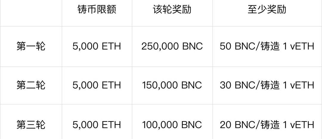 鑄造1個ETH將獲得1vETH,若鑄造時間在該輪倒計時結束前或鑄滿前,則記為該輪次空投成功參與者,獲得對應的BNC獎勵。持有vETH可獲得ETH2.0Staking收益,同時vETH可在Uniswap、Loopring等DEX進行交易,當前流動性深度為$200萬美金,vETH根據市場情緒產生價格波動,但當ETH2.0開啟贖回時,1vETH可通過Bifrost以1ETH的價格進行剛性贖回。