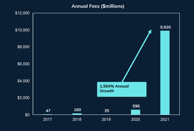 對ETH的看漲預測始于以太坊如何在2021年產生了近100億美元的費用。該報告稱,自2020年以來,年增長率為1564%。