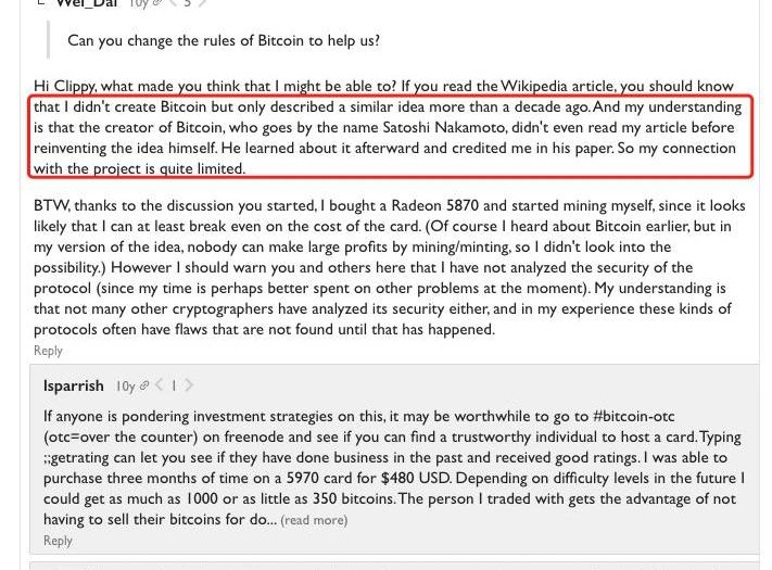 他表示,自己也很好奇中本聰是誰和他為什么選擇保持匿名。當面對“您能否改變比特幣的規則來幫助我們?”這一問題時,他再次否認自己是中本聰,也否認了“中本聰發明比特幣時借鑒了很多戴維的設計”這一說法:“我的理解是,比特幣的創造者——中本聰甚至在自己重新發明這個想法之前都沒有讀過我的文章。之后他才了解到我的想法,便在論文中稱贊了我。所以我其實與這個項目并沒有什么關系。”