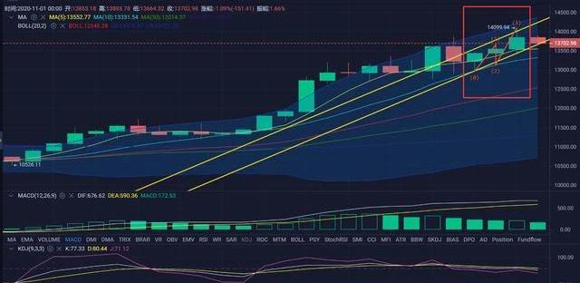 XRP/HKD-4.08%昨日比特幣上行走勢強勢,刷新高點突破14000預期位置,高點觸及14100一線承壓回調,在13600附近回調之勢停止。日內行情凌晨再度小幅回調,試探了一波13600區域支撐強度,目前價格在13800位置附近運行,整體的走勢處于回調整理,日內若是價格不能企穩14000,行情有進一步回調的可能。那么在11月第一天月線開線以及本周最后一天周線收線之際,套空的朋友就有出局的機會了!