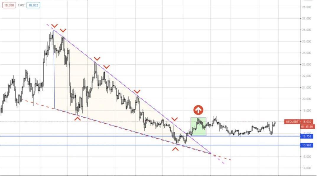 近期NEO的下降楔形突破顯然已經發生。然而隨后又出現了一段時間的橫盤。這很可能是一個真突破。這是因為確認點的數量很高(6個),位于下降楔形線的下行阻力線上。