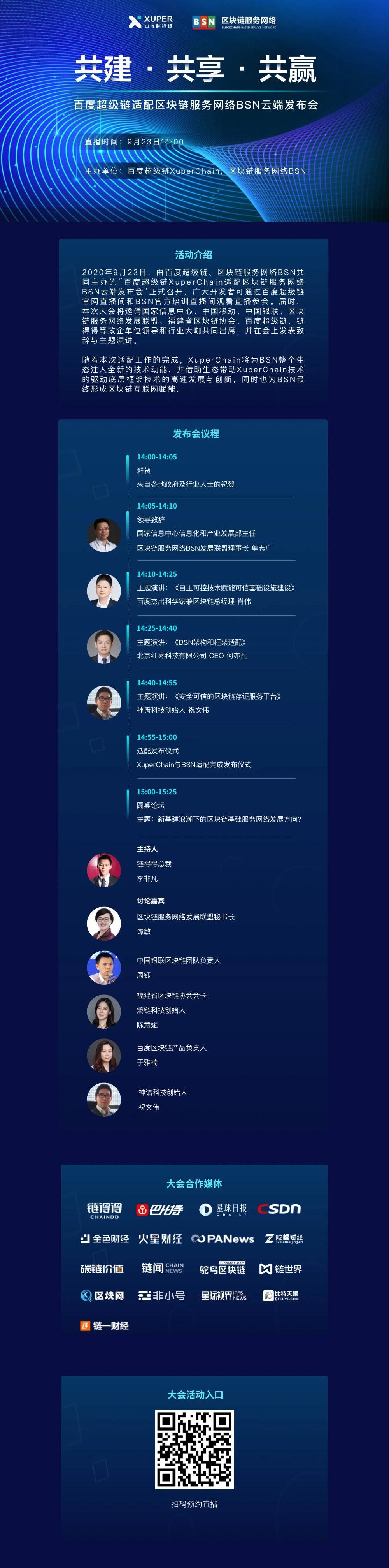 XRP/HKD-3.04%2020年9月23日,由百度超級鏈、區塊鏈服務網絡BSN共同主辦的“百度超級鏈XuperChain適配區塊鏈服務網絡BSN云端發布會”正式召開,廣大開發者可通過百度超級鏈官網直播間和BSN官方培訓直播間觀看直播參會。