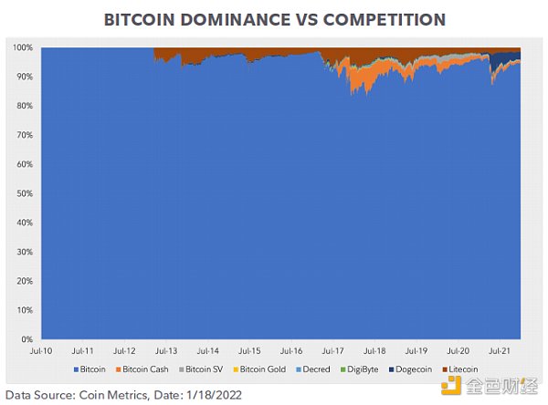 如果投資者正在尋找一種數字資產作為貨幣商品,一種有能力作為價值儲存的資產,那么他們自然會選擇擁有最大、最安全、去中心化和網絡流動性強的數字資產。比特幣作為有史以來第一個真正稀缺的數字資產,獲得了先發優勢,并隨著時間的推移保持了這種優勢。值得注意的是,雖然比特幣的主導地位和其市值在整個數字資產生態系統的百分比已經從100%下降到大約50%,但這不是由于它的規模萎縮造成的,而是因為生態系統的其余部分在增長。