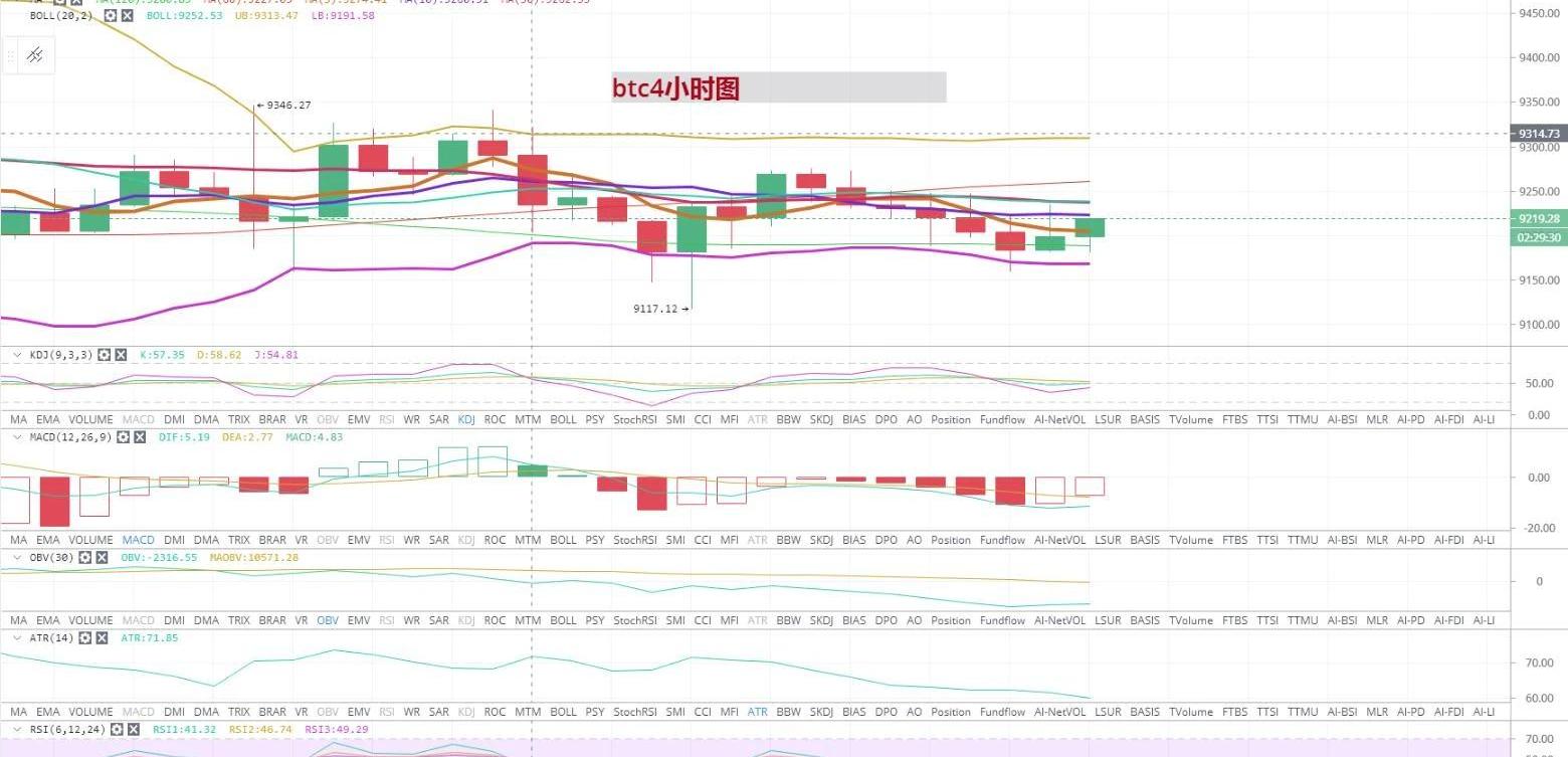 持幣者從附圖日線圖上看,比特幣行情近幾日一直處于盤整期,在中軌(9200)美元一線徘徊,布林帶收口。目前幣價受到中軌一線的支撐,在KDJ指標中KDJ三線向下發散,J線快要進入超賣區域。MACD中多頭量能有些不足,快慢線在0軸下方向上運行。